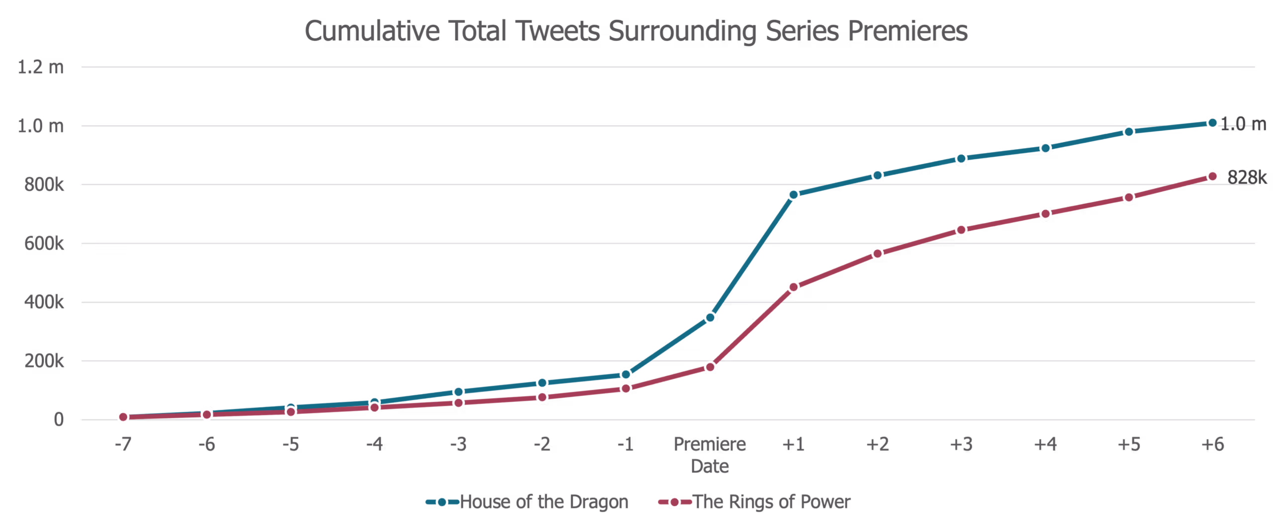 - When comparing the week prior to and the week following the premiere episodes of the two series, House of the Dragon has earned over 1 million Total Tweets, 22% higher than The Rings of Power’s Total Tweet Count