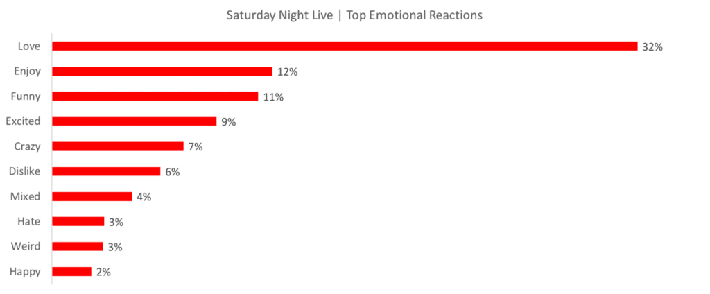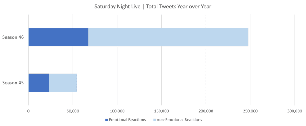 - Emotional Reactions in Season 46’s premiere grew nearly 3x compared to the Season 45 premiere of Saturday Night Live, and total Tweets grew over 5x year over year