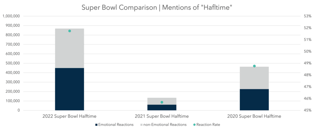 - Beyond driving higher rates of Total Tweets, the 2022 halftime show also earned the highest Reaction Rate, or passion rate, when compared to the previous two Super Bowl Halftime Shows.