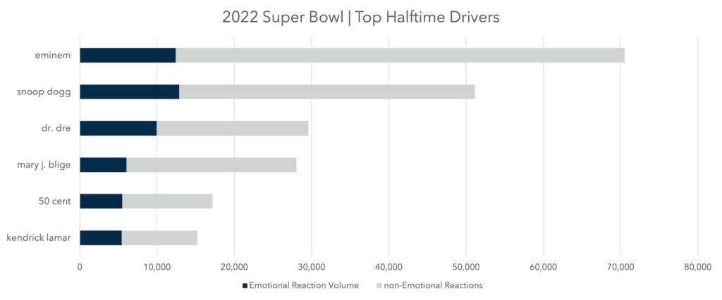 - Outside of Eminem’s show-stopping performance, Snoop Dogg, Dr. Dre, and Mary J. Blige were also able to drive extremely high levels of conversation during the 2022 Super Bowl Halftime Show